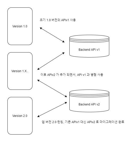 아래의 예시를 보면, 초기 버전 1.0의 경우 APIv1 을 사용하다가 신규 기능 업데이트나 변경 사항에 대해 APIv2 가 새로 쓰이게 될 경우 앱이나 서버의 변경 과도기에서 기존의 APIv1 과 APIv2 가 병행으로 사용되는 구간이 있을 수 있습니다.